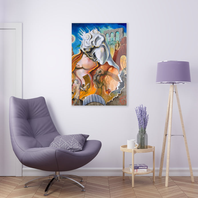 This painting is based upon one of the most famous love stories of all time, Romeo and Juliet. Now remember even though that this appears to be occurring at a much earlier period such as in early Greek times Anton is a surreal artist and can paint an idea and place it at any. period of time. Surrealism is based upon ideas being extremely creative and none of it has to be based upon a reality.