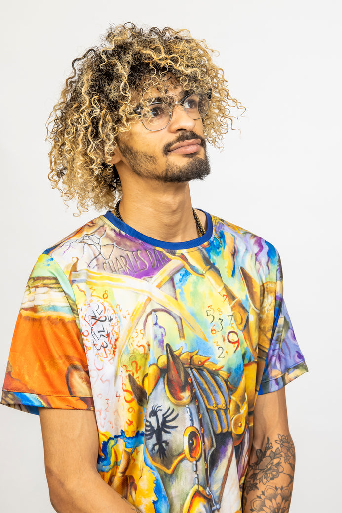 Our shirts are made with a minimum of 95% polyester. This was a very interesting painting done by Anton Brzezinski based upon the fact that time has played such an important role throughout his life. While Anton was younger he was in the military and he actually had to crack codes and time was of the utmost importance. I remember him telling me that he always felt on a time constraint during the military because lives were at stake if certain codes weren't cracked. He then went on to say life is so short yet he always feels rushed. He created this painting to show how he always felt time was a huge factor in his artistic career.