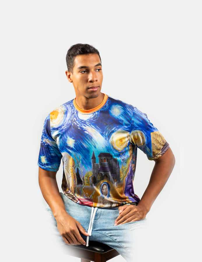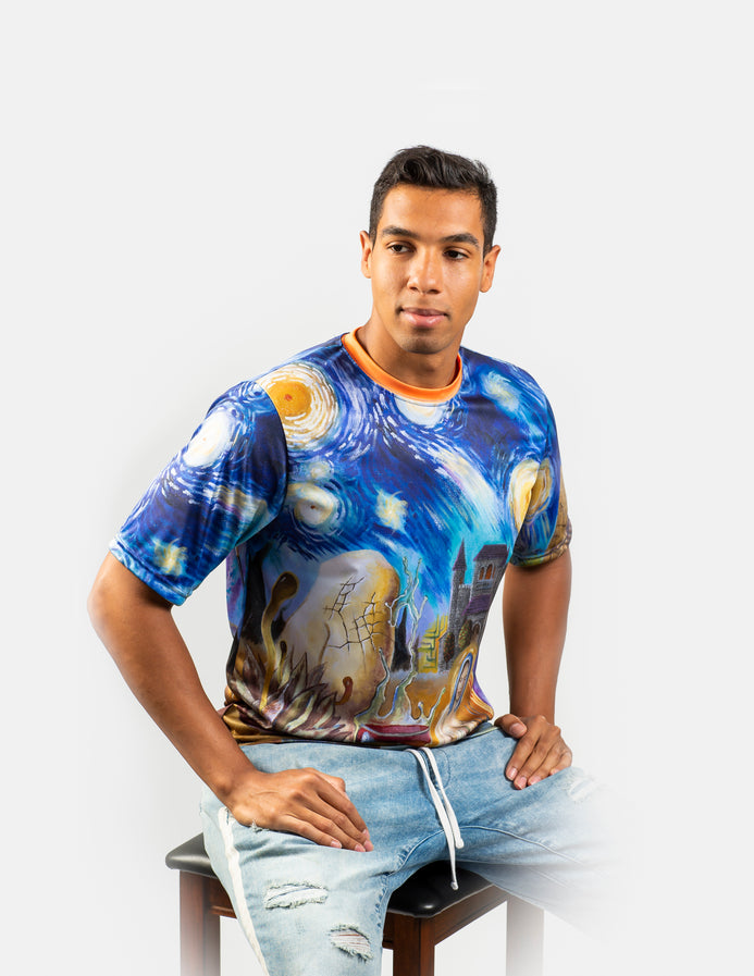 Our quality shirts are the newest and best Because the dyes are burned into the fabric and combined with them permanently making the shirt virtually impossible to fade and the colors our going to be vibrant for many years to come whereas the other processes cannot compare to this.. One of the most beneficial things of die sublimation is that the dies or evaporated so quickly into the fabric that there is very little bleeding and changing coloration so that the shirt looks almost identical to the actual artwork itself and that is why we chose it to represent our artist since we feel he’s the best we want to use the best techniques available as well as the best polyester fibers which are bought in sheets And no less than 95% of the fabric is anything but the finest polyester you can buy and must be for the image to adhere to the fabric. We buy the materials and all of our shirts is made from polyester and we burn the actual art image itself into the flat piece of fabric where it is then cut out individually and then soon bye a person making each shirt different than the next. Even though the same image is on the shirt that doesn’t mean the placement will be the same since each individual that sews the complete short putting it together May have cut the fabric a little differently than the next individual off-center in the work and making the shirt unique in itself rather than us just buying an already shown polyester fiber shirt mixed with some other fabric as all the rest of ours is the finest material we have the most stunning and beautiful active wear around And such endless amounts and all different styles so we could continue for years to come giving everyone the best product we can making it with the best materials with the best imagery I feel available.